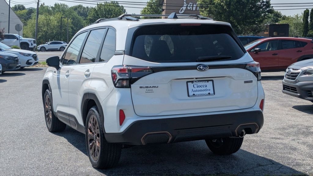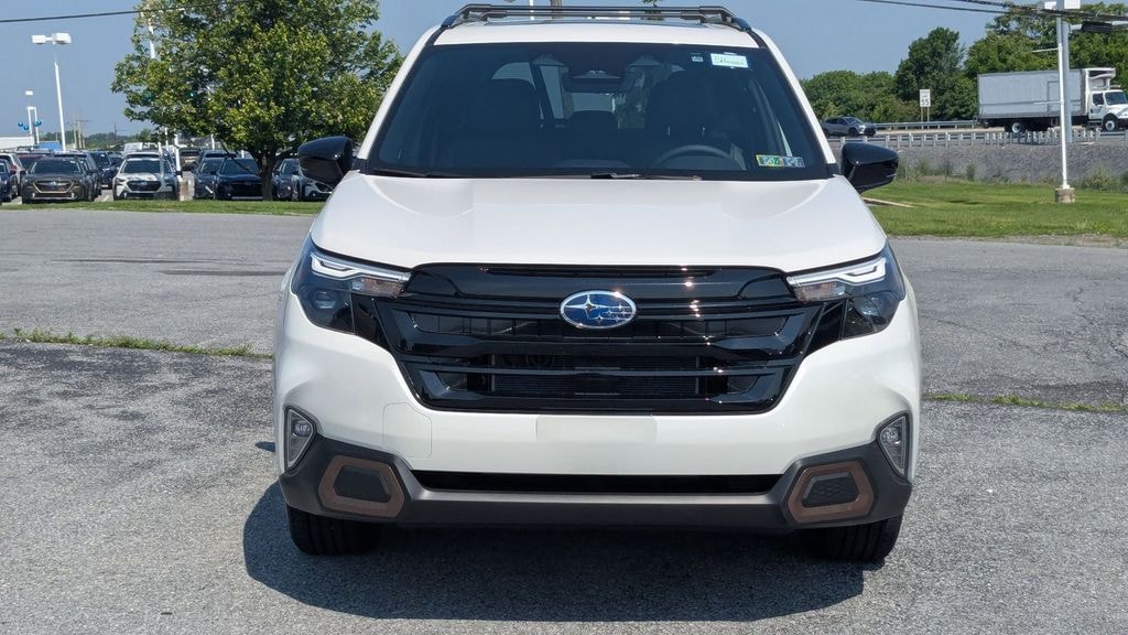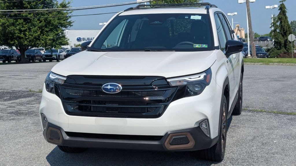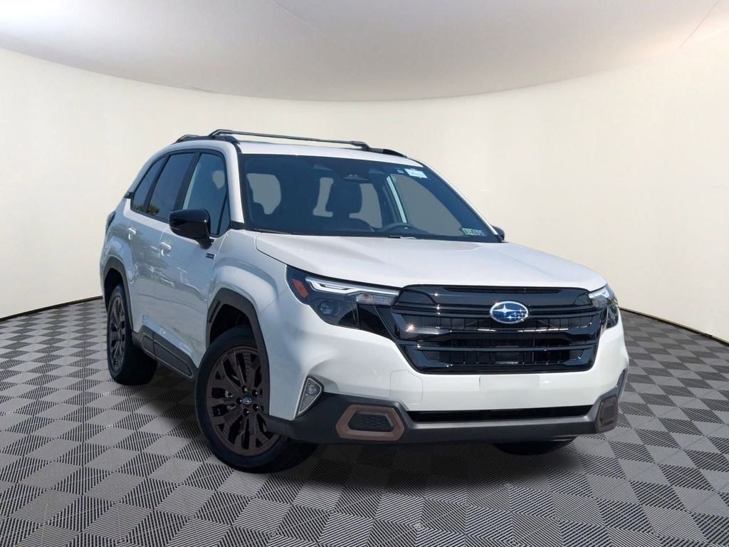 Crystal White Pearl 2025 Subaru Forester Hybrid Sport AWD Lineartronic CVT 2.5L 4-Cylinder DOHC 16V 2.5L 4-Cylinder DOHC 16V, 11 Speakers, 4-Wheel Disc Brakes, ABS brakes, Air Conditioning, Alloy wheels, AM/FM radio: SiriusXM with 360L, Anti-whiplash front head restraints, Auto High-beam Headlights, Auto-Dimming Exterior Mirror w/Approach Light, Auto-Dimming Mirror w/Compass & HomeLink, Automatic temperature control, Brake assist, Bumpers: body-color, Compass, Crossbar Set - Aero, Driver door bin, Driver vanity mirror, Dual front impact airbags, Dual front side impact airbags, Electronic Stability Control, Emergency communication system: MySubaru Safety (3-year free trial), Exterior Parking Camera Rear, Four wheel independent suspension, Front anti-roll bar, Front Bucket Seats, Front Center Armrest, Front dual zone A/C, Front fog lights, Front reading lights, Fully automatic headlights, harman/kardon® Speakers, Heated door mirrors, Heated Front Bucket Seats, Heated front seats, Illuminated entry, Knee airbag, LED Upgrade, Low tire pressure warning, Navigation system: TomTom Navigation w/what3words, Occupant sensing airbag, Outside temperature display, Overhead airbag, Overhead console, Panic alarm, Passenger door bin, Passenger vanity mirror, Power door mirrors, Power driver seat, Power Liftgate, Power moonroof: Panoramic, Power steering, Power windows, Radio data system, Radio: Subaru 11.6" Multimedia Navigation System, Rear anti-roll bar, Rear seat center armrest, Rear window defroster, Rear window wiper, Remote keyless entry, Security system, Speed control, Speed-sensing steering, Split folding rear seat, Spoiler, Sport StarTex Upholstery, Standard Model, Steering wheel mounted audio controls, Tachometer, Telescoping steering wheel, Tilt steering wheel, Traction control, Trip computer, Turn signal indicator mirrors, Variably intermittent wipers, Wheels: 19" x 7.5 J Bronze Finish Aluminum-Alloy, 2.5L 4-Cylinder DOHC 16V.