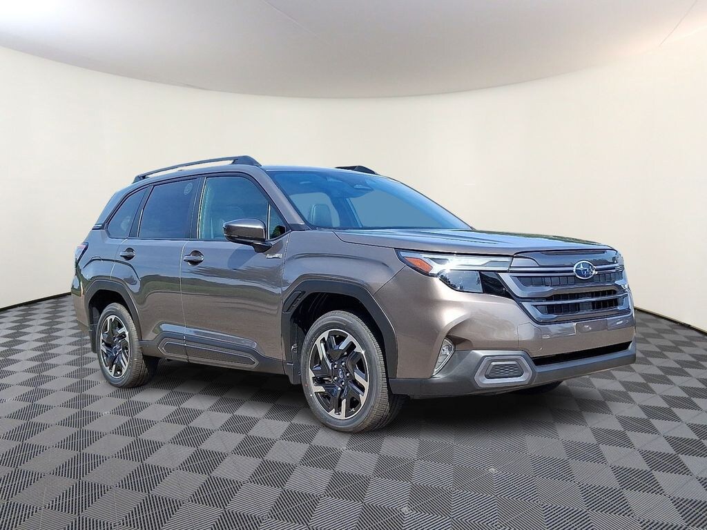 Bronze 2025 Subaru Forester Hybrid Limited AWD Lineartronic CVT 2.5L 4-Cylinder DOHC 16V 2.5L 4-Cylinder DOHC 16V, 11 Speakers, 4-Wheel Disc Brakes, ABS brakes, Air Conditioning, Alloy wheels, AM/FM radio: SiriusXM with 360L, Anti-whiplash front head restraints, Auto High-beam Headlights, Auto-Dimming Exterior Mirror w/Approach Light, Auto-Dimming Mirror w/Compass & HomeLink, Automatic temperature control, Brake assist, Bumpers: body-color, Cargo Sidewall Protector, Compass, Driver door bin, Driver vanity mirror, Dual front impact airbags, Dual front side impact airbags, Electronic Stability Control, Emergency communication system: MySubaru Safety (3-year free trial), Exterior Parking Camera Rear, Four wheel independent suspension, Front anti-roll bar, Front Bucket Seats, Front Center Armrest, Front dual zone A/C, Front fog lights, Front reading lights, Fully automatic headlights, harman/kardon® Speakers, Heated door mirrors, Heated Front Bucket Seats, Heated front seats, Illuminated entry, Knee airbag, Low tire pressure warning, Navigation system: TomTom Navigation w/what3words, Occupant sensing airbag, Outside temperature display, Overhead airbag, Overhead console, Panic alarm, Passenger door bin, Passenger vanity mirror, Power door mirrors, Power driver seat, Power Liftgate, Power moonroof: Panoramic, Power passenger seat, Power steering, Power windows, Radio data system, Radio: Subaru 11.6" Multimedia Navigation System, Rear anti-roll bar, Rear Bumper Cover, Rear seat center armrest, Rear window defroster, Rear window wiper, Remote keyless entry, Security system, Speed control, Speed-sensing steering, Splash Guards, Split folding rear seat, Spoiler, Standard Model, StarTex Upholstery, Steering wheel mounted audio controls, Tachometer, Telescoping steering wheel, Tilt steering wheel, Traction control, Trip computer, Turn signal indicator mirrors, Variably intermittent wipers, Wheels: 18" x 7.0 J Dark Metallic Aluminum-Alloy, 2.5L 4-Cylinder DOHC 16V.