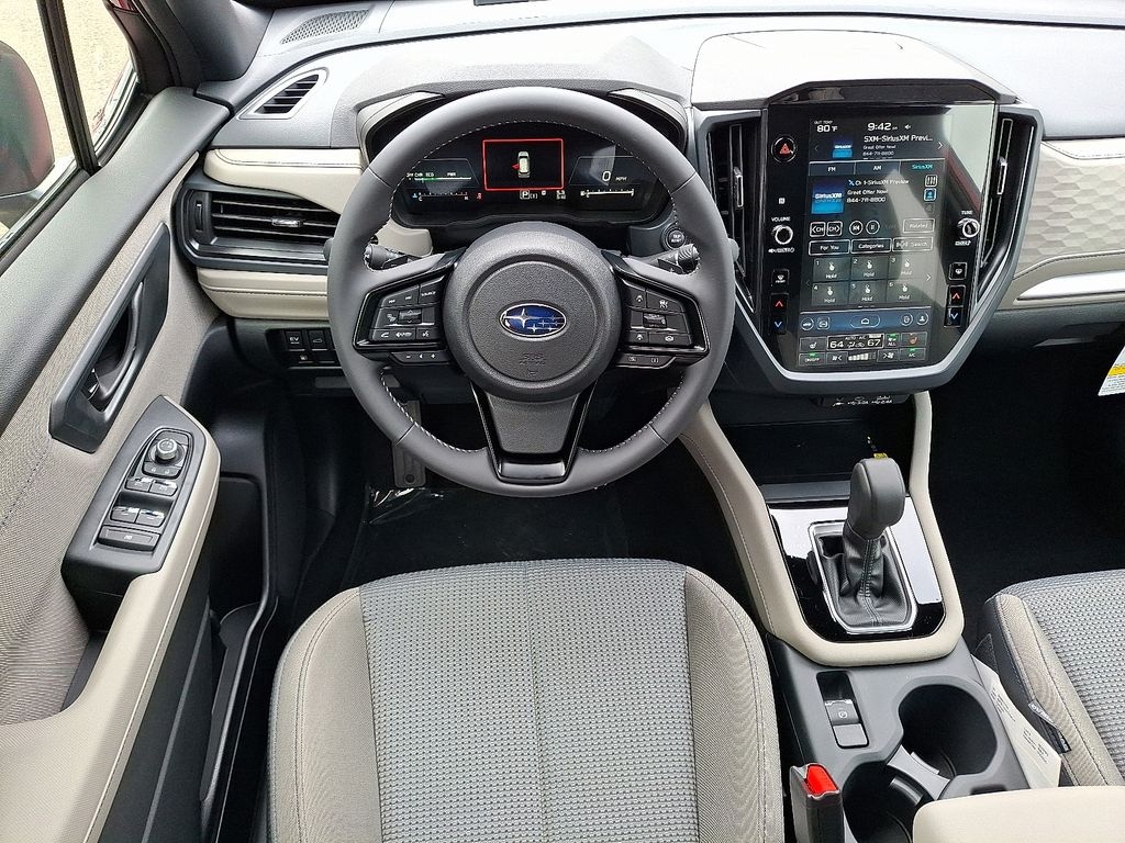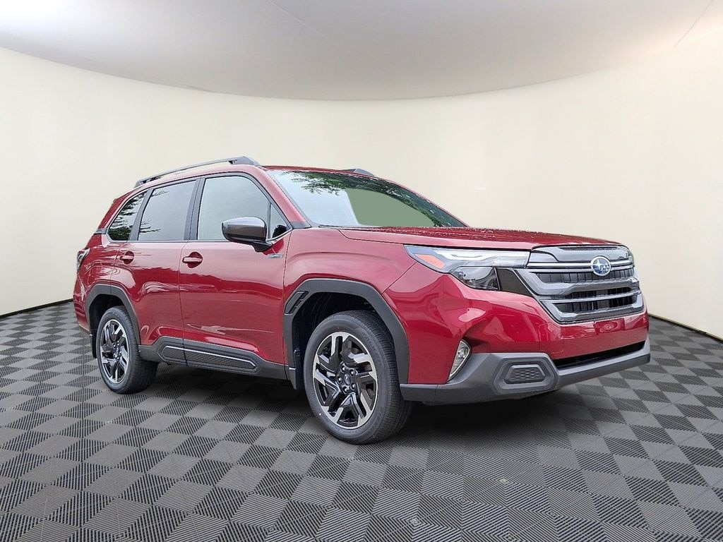 Crimson Red 2025 Subaru Forester Hybrid Premium AWD Lineartronic CVT 2.5L 4-Cylinder DOHC 16V 2.5L 4-Cylinder DOHC 16V, 4-Wheel Disc Brakes, 6 Speakers, ABS brakes, Air Conditioning, Alloy wheels, AM/FM radio: SiriusXM with 360L, Anti-whiplash front head restraints, Auto High-beam Headlights, Auto-Dimming Mirror w/Compass & HomeLink, Automatic temperature control, Brake assist, Bumpers: body-color, Cargo Sidewall Protector, Cargo Tray, Compass, Door Scuff Protector, Driver door bin, Driver vanity mirror, Dual front impact airbags, Dual front side impact airbags, Electronic Stability Control, Emergency communication system: MySubaru Safety (3-year free trial), Exterior Parking Camera Rear, Four wheel independent suspension, Front anti-roll bar, Front Bucket Seats, Front Center Armrest, Front dual zone A/C, Front fog lights, Front reading lights, Fully automatic headlights, Heated door mirrors, Heated Front Bucket Seats, Heated front seats, Illuminated entry, Knee airbag, LED Upgrade, Low tire pressure warning, Navigation system: TomTom Navigation w/what3words, Occupant sensing airbag, Outside temperature display, Overhead airbag, Overhead console, Panic alarm, Passenger door bin, Passenger vanity mirror, Power door mirrors, Power driver seat, Power Liftgate, Power moonroof: Panoramic, Power steering, Power windows, Premium Cloth Upholstery, Radio data system, Radio: Subaru 11.6" Multimedia Navigation System, Rear anti-roll bar, Rear Bumper Cover, Rear seat center armrest, Rear window defroster, Rear window wiper, Remote keyless entry, Security system, Speed control, Speed-sensing steering, Splash Guards, Split folding rear seat, Spoiler, Standard Model, Steering wheel mounted audio controls, Tachometer, Telescoping steering wheel, Tilt steering wheel, Traction control, Trip computer, Variably intermittent wipers, Wheels: 18" x 7.0 J Dark Metallic Aluminum-Alloy, 2.5L 4-Cylinder DOHC 16V.